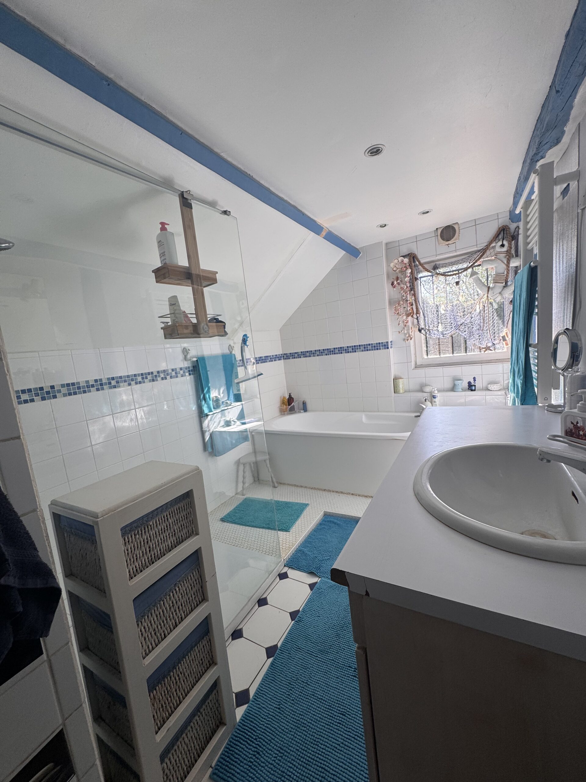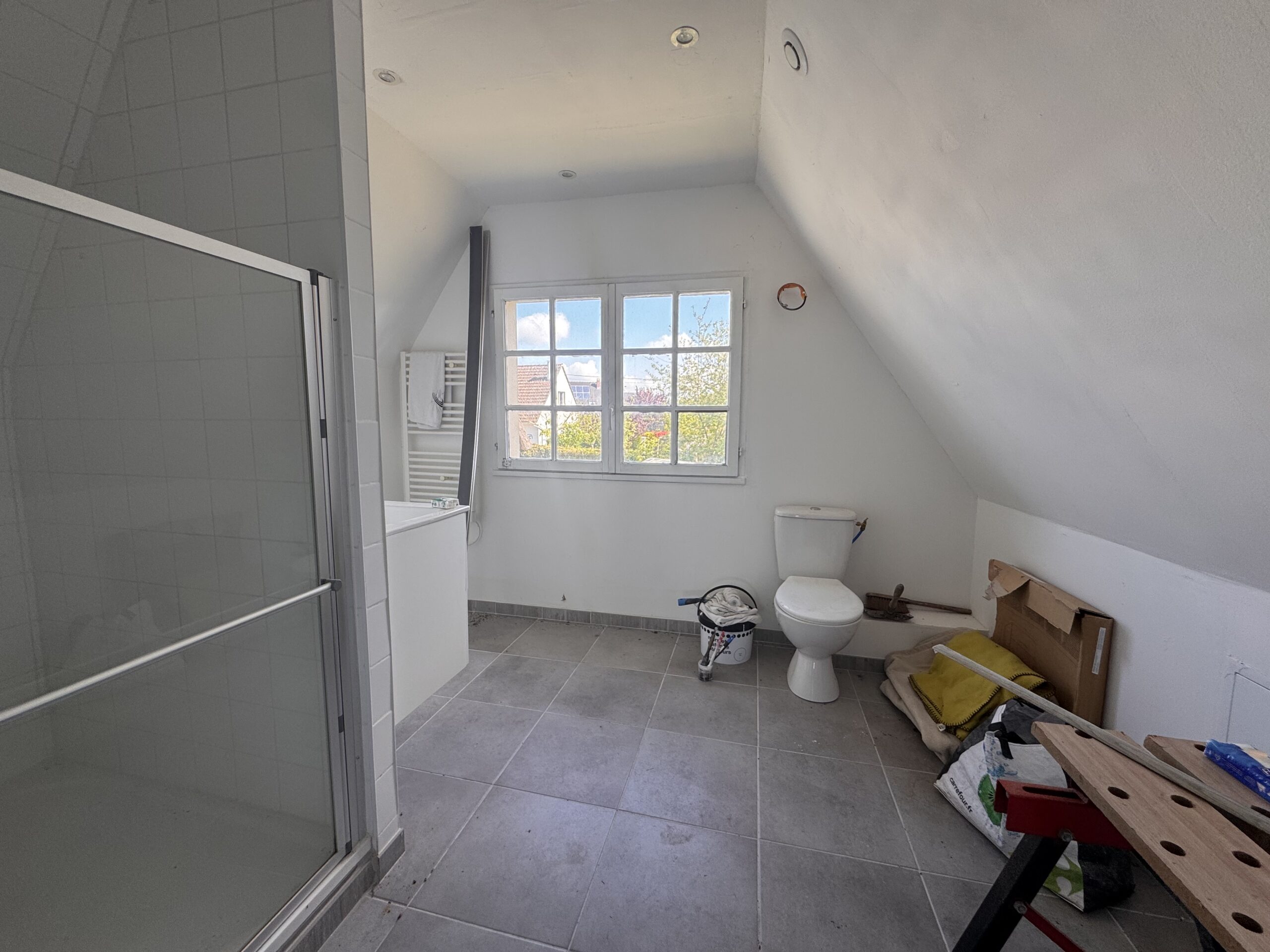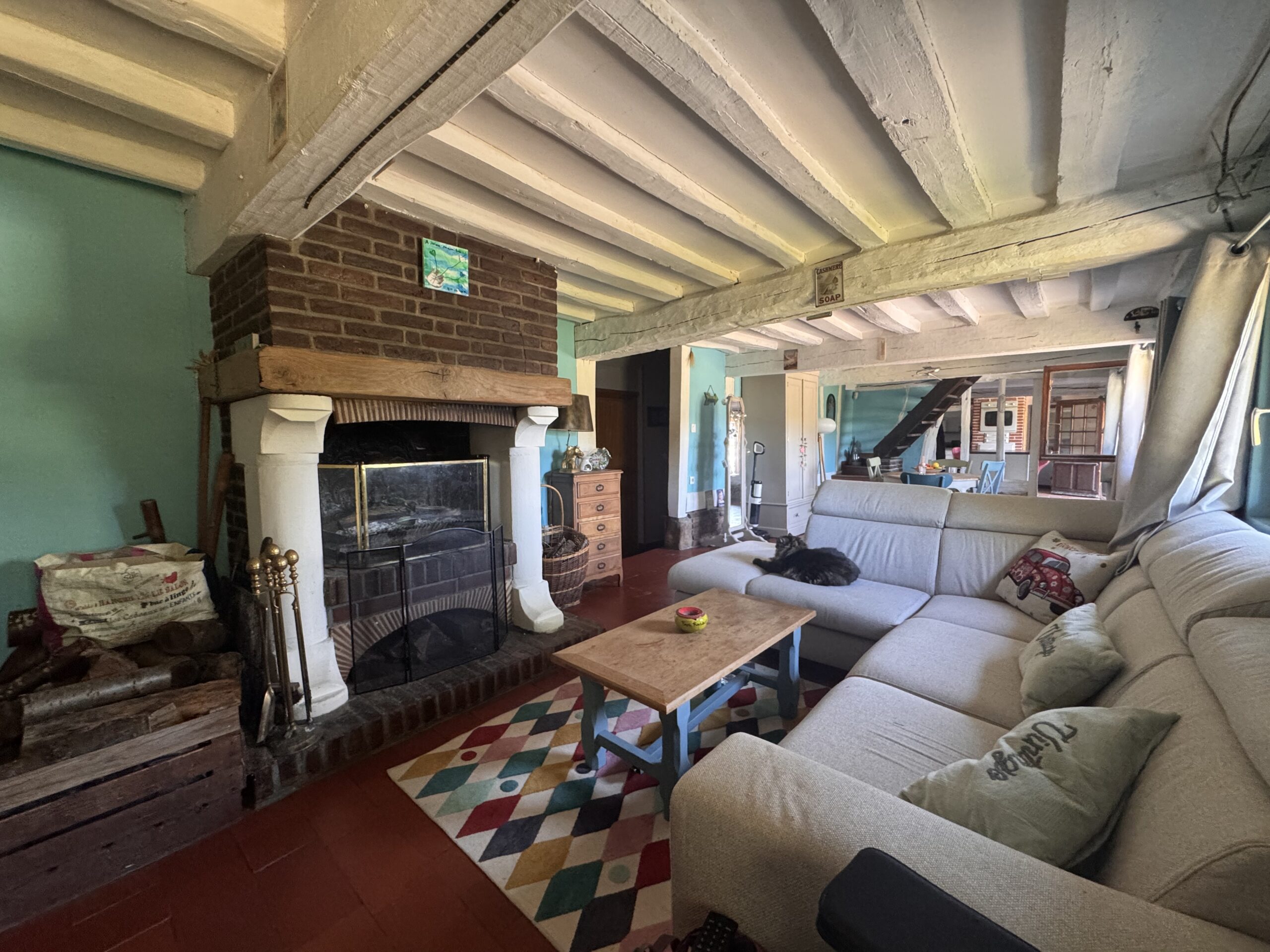 Cuisine équipée, beau séjour salon lumineux « plein sud » avec cheminée, cellier, dégagement, salle de bains douche, une chambre avec placards au rez-de-chaussée,